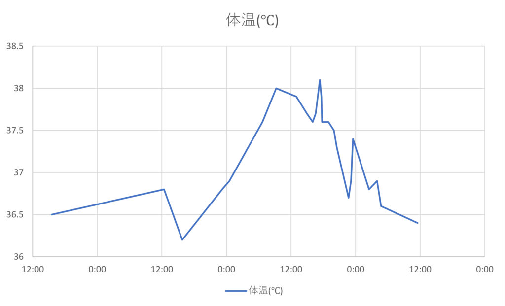 接種当日の夜から熱が上がり始め、翌日は38.0℃まで上がった。下がり始めたのは2日目の明け方から。